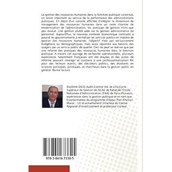 La gestion des ressources humaines dans la fonction publique constitue, un levier important au service de la performance des administrations publiques. En dépit d'un volonté affichée d'intégrer la dimension de management des ressources humaines dans un vaste chantier de modernisation de l'administration, les pratiques de gestion n'ont que peu évolué. Une gestion plutôt axée sur la gestion administrative du personnel. Aujourd'hui, le nouveau contexte économique contrasté a poussé les gouvernements à revitaliser les services publics en matière de gestion des ressources humaines. l'objectif n'est pas exclusivement budgétaire ou démographiques, mais aussi répondre aux besoins des usagers par un service public de qualité. Ceci ne peut se réaliser que par une refonte des pratiques des ressources humaines dans la fonction publique. A travers cet ouvrage de recherche opérationnelle, plusieurs expériences notamment françaises ont été étayées et des pistes de réforme pouvant interagir et conduire à une professionnalisation RH pour des lecteurs avertis, des décideurs publics, des étudiants en sciences politiques, juridiques, et chercheurs dans la gestion public en général. Bonne lecture